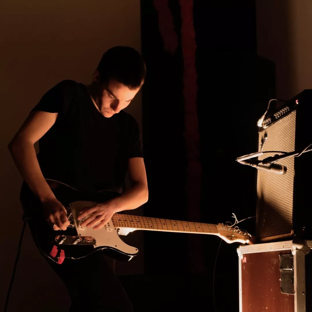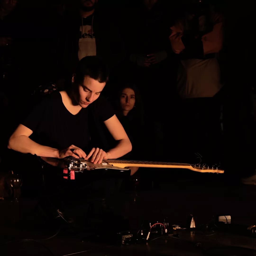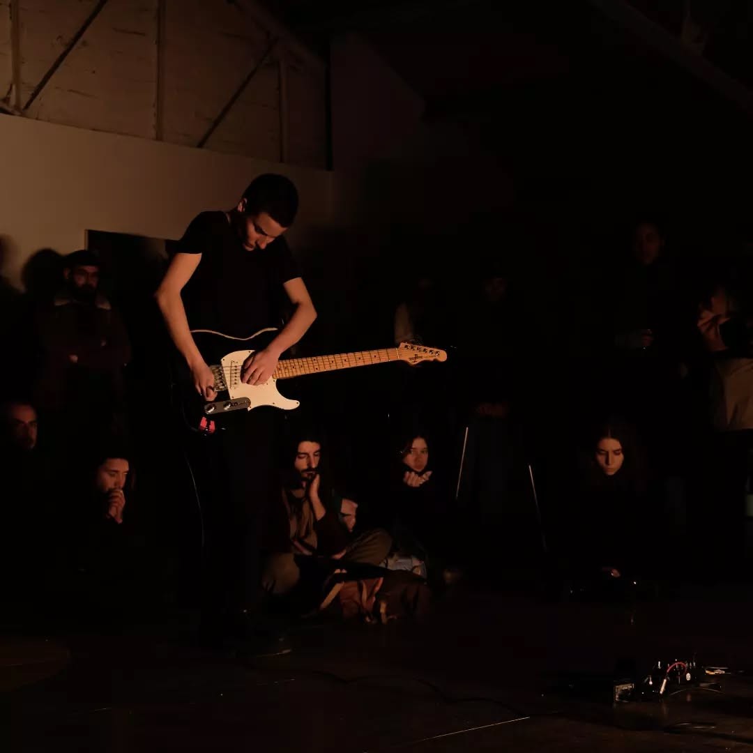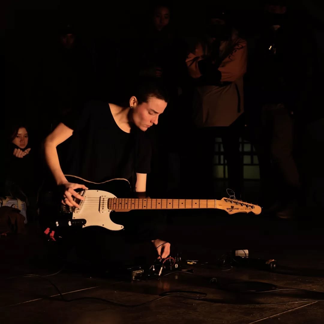 Nina Garcia mène un travail de recherche et de création autour de la guitare électrique, à mi-chemin entre musique improvisée et noise. Son dispositif est réduit au minimum : une guitare, une pédale et un ampli, avec lesquels elle sculpte le son et fouille le chaos pour en faire émerger l’inouï. Pour son solo Mariachi, l’attention est donnée au geste et à la recherche sur l’instrument, ses résonances, ses limites, ses extensions, ses impuretés, ses recoins audibles : aller avec ou contre lui, le contenir ou le laisser sonner, le soutenir ou le violenter. On y trouve en vrac : feedbacks, crépitements, courts circuits, impacts, harmoniques, grincements, et par hasard, notes et accords presque parfaits. Un duo plus qu’un solo, qui sidère par ce mélange de maîtrise technique et de liberté totale.