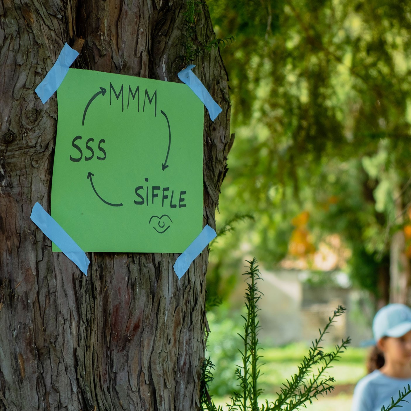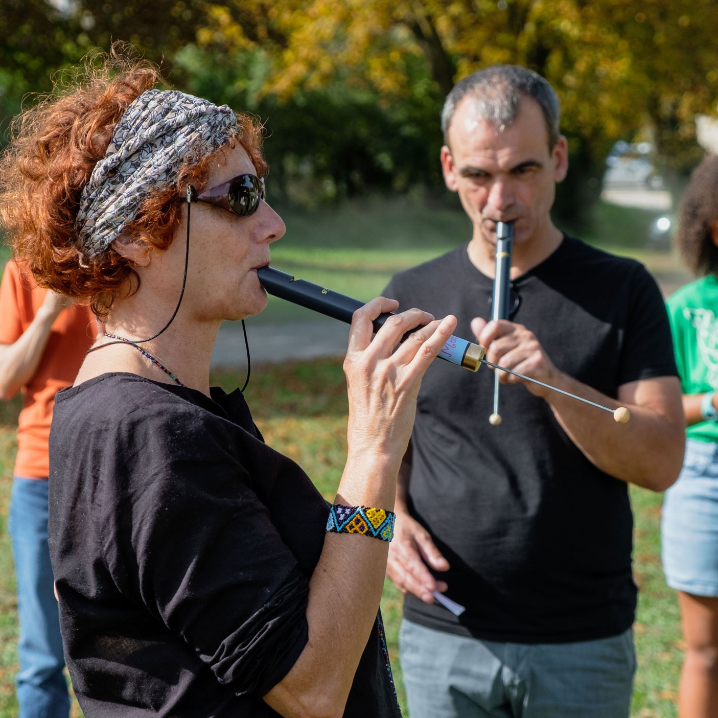 Un groupe de performers munis d’objets sonnants se livre à une suite de jeux sonores. Au sol, à l’instar d’un terrain multi-sport, un réseau de lignes de couleur encadre leurs actions. Loin du simple prétexte ou de la seule contrainte, le but des joueurs est avant tout de gagner la partie. En invitant les spectateurs à suivre leur activité et à en percer les ressorts, le jeu se fait progressivement rituel puis spectacle, avec, pour ligne d’horizon, la fusion du ludique et du musical.