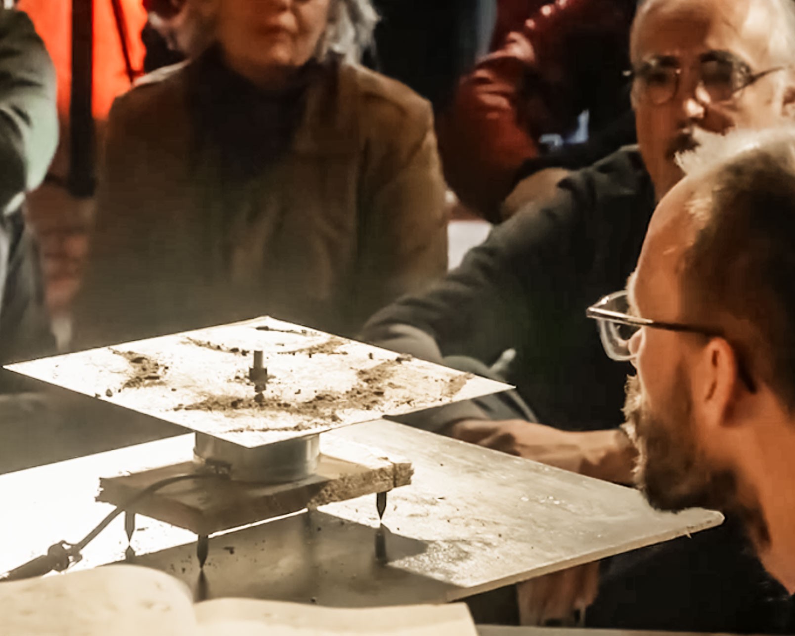 Pour Fouler, creuser, crisser, les deux artistes créeront une petite usine à sons. Cette installation modulaire, développée de manière empirique dans l’esprit du Do It Yourself, transposera les fragments d’un environnement dans le domaine de l’audible. Capable de s’adapter à chaque nouveau lieu, elle viendra questionner les frontières qui séparent matière physique et matière sonore d’une part, espaces de jeu et espaces de vie d’autre part.