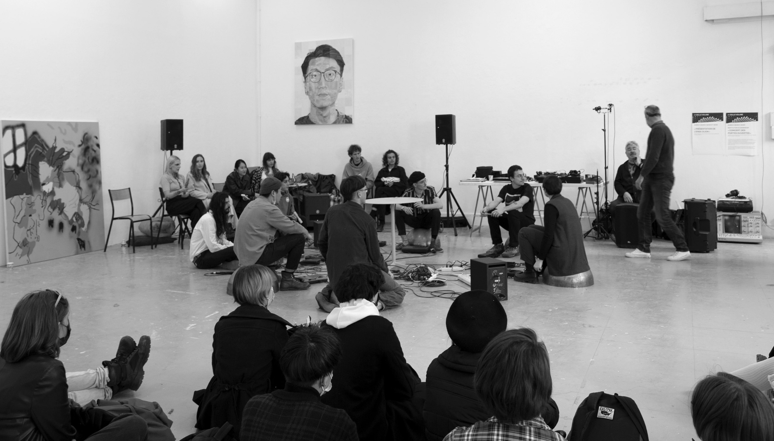 Chaque année, les portes ouvertes de l’École Nationale Supérieure d’Art de Dijon font suite à une semaine de workshop, dont les résultats sont visibles par les visiteur·euse·s. De la même manière, le concert des portes ouvertes est le fruit d’une semaine de travail avec Nicolas Thirion, musicien et directeur artistique, invité à mener avec des étudiant·e·s de toutes promotions confondues une recherche autour du son.
