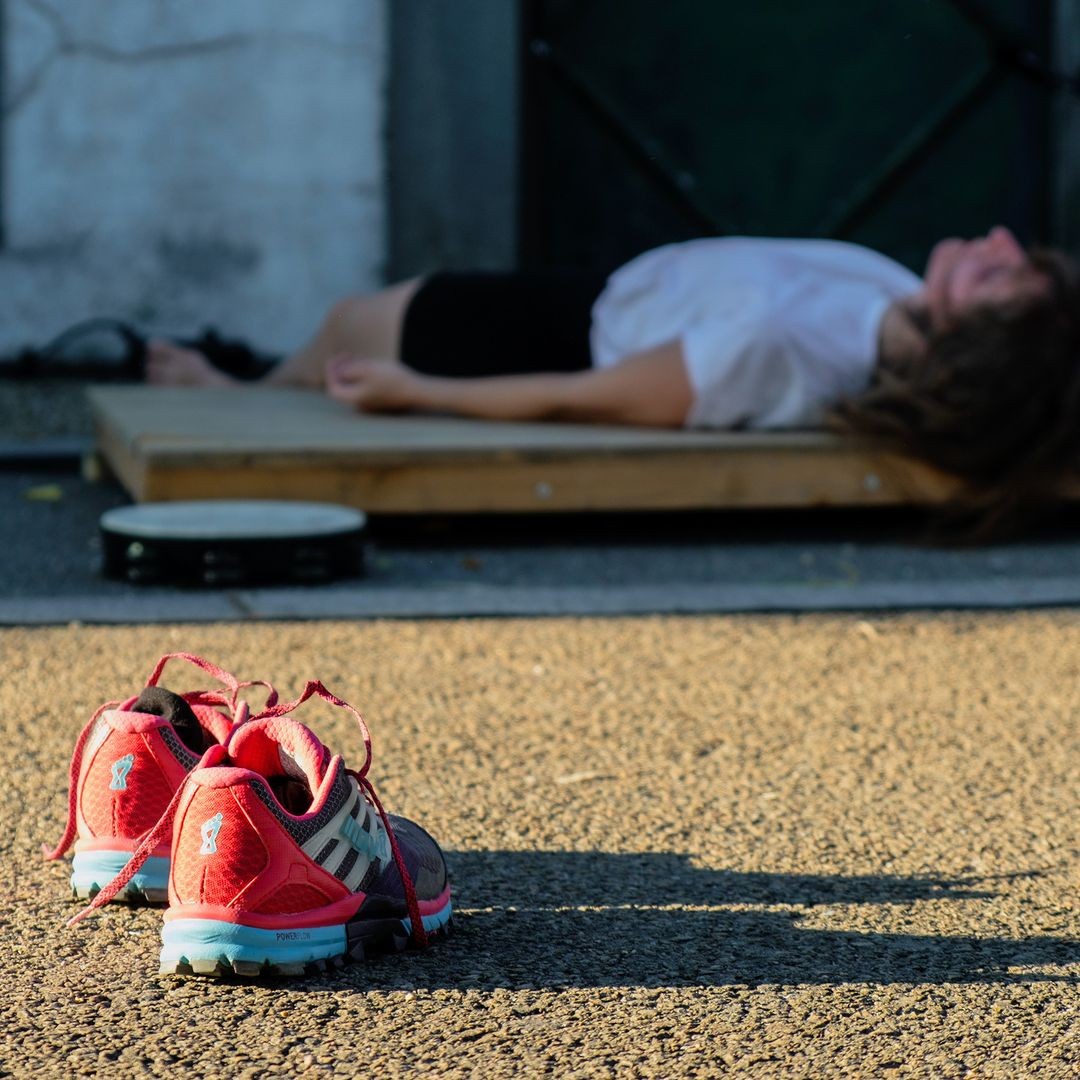 Run est une performance de trente minutes où lui joue de la vielle à roue, pendant qu’elle court sur un socle d’1m2 équipé de micros, entre percussions et plancher de danse traditionnel.