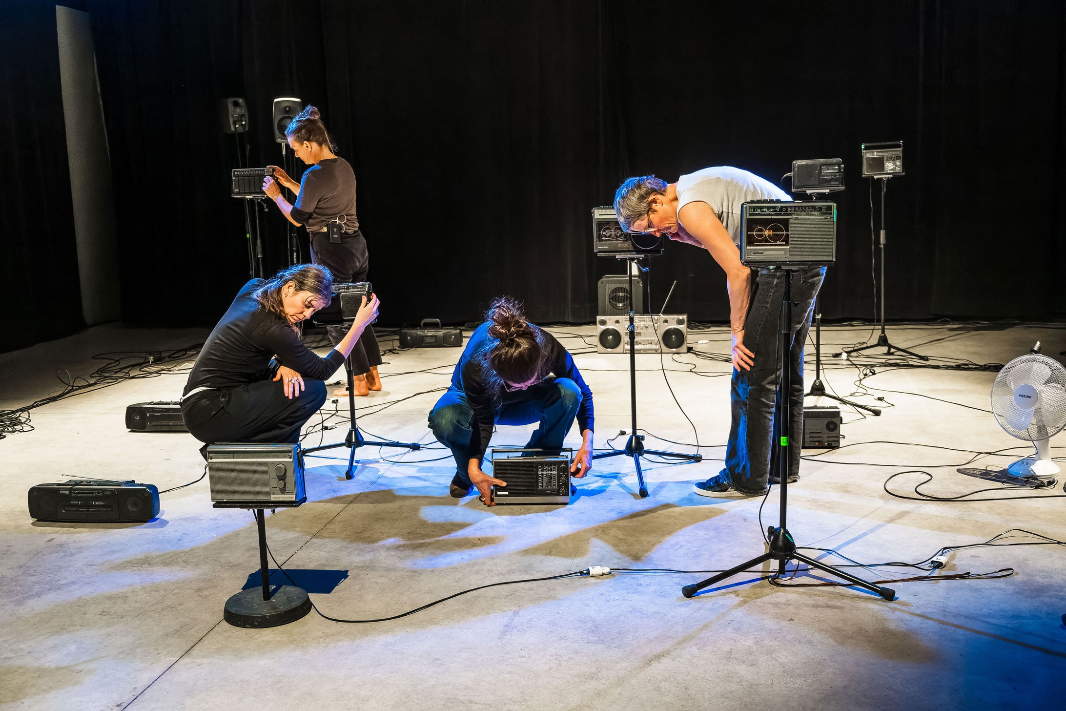 Vivant et imprévisible, il constitue pour elles une richesse qui devient la matière sensible de leur prochain spectacle, Ce qui nous reste, créé dans le cadre du Festival Souffle à ici l’onde - Centre national de création musicale. Au milieu d’un plateau peuplé de transistors aux couleurs sonores hétéroclites, elles expérimentent de manière ludique ce que peut le son. Accompagnées par Carla Pallone, violoniste, compositrice et la danseuse et chorégraphe Marie Cambois, elles jouent à déplacer les éléments, créent des interférences ou des larsens sauvages, modifient les fréquences. Elles transforment ainsi l’espace sonore et composent une partition unique, dans laquelle les champs électromagnétiques sont bousculés par la présence des corps. Un orchestre à faire sonner, dans lequel cohabitent le violon acoustique, une lutherie électronique, les voix parlées, chantées qui semblent jaillir de partout et se répondre pour caresser une question commune : comment habite-t-on l’absence ?