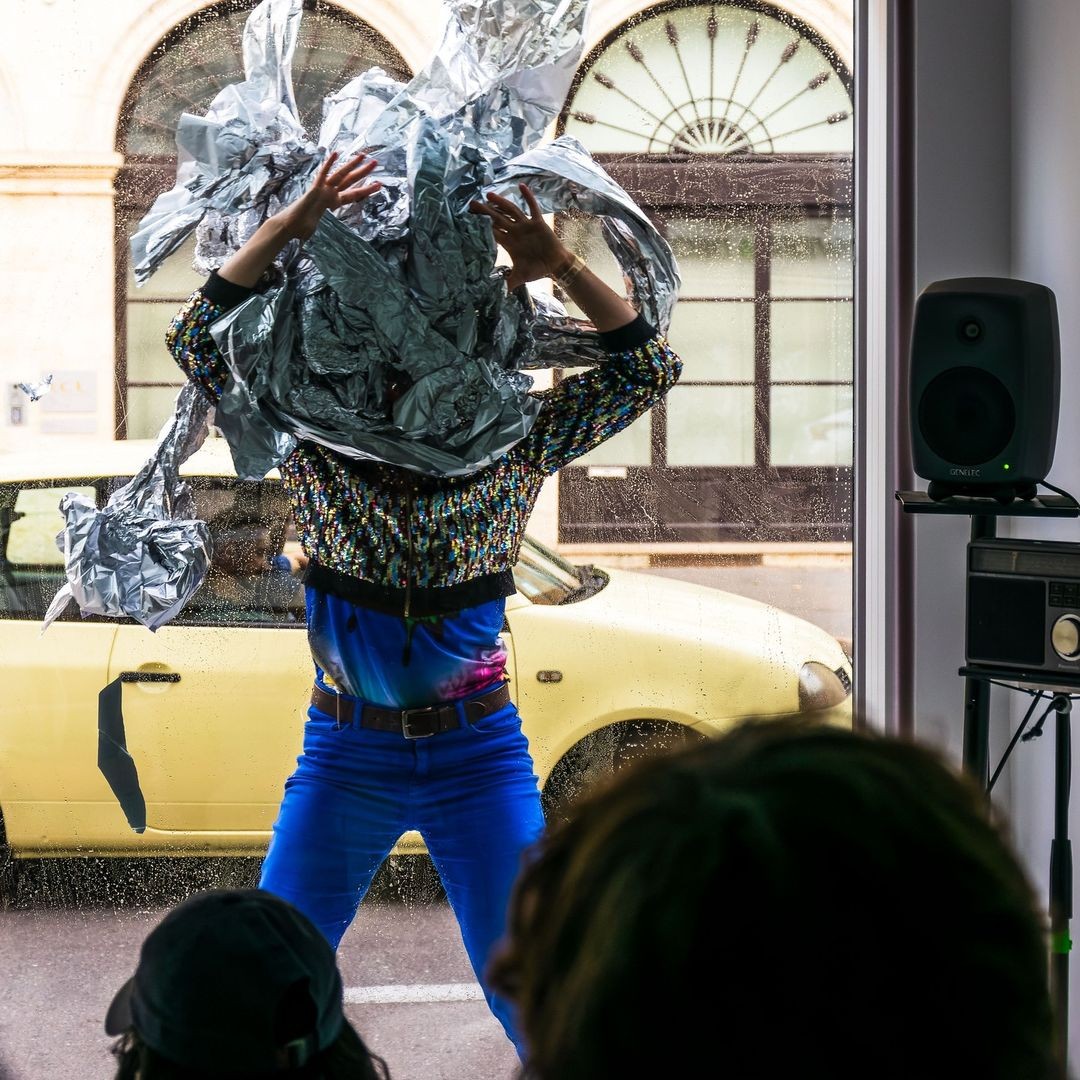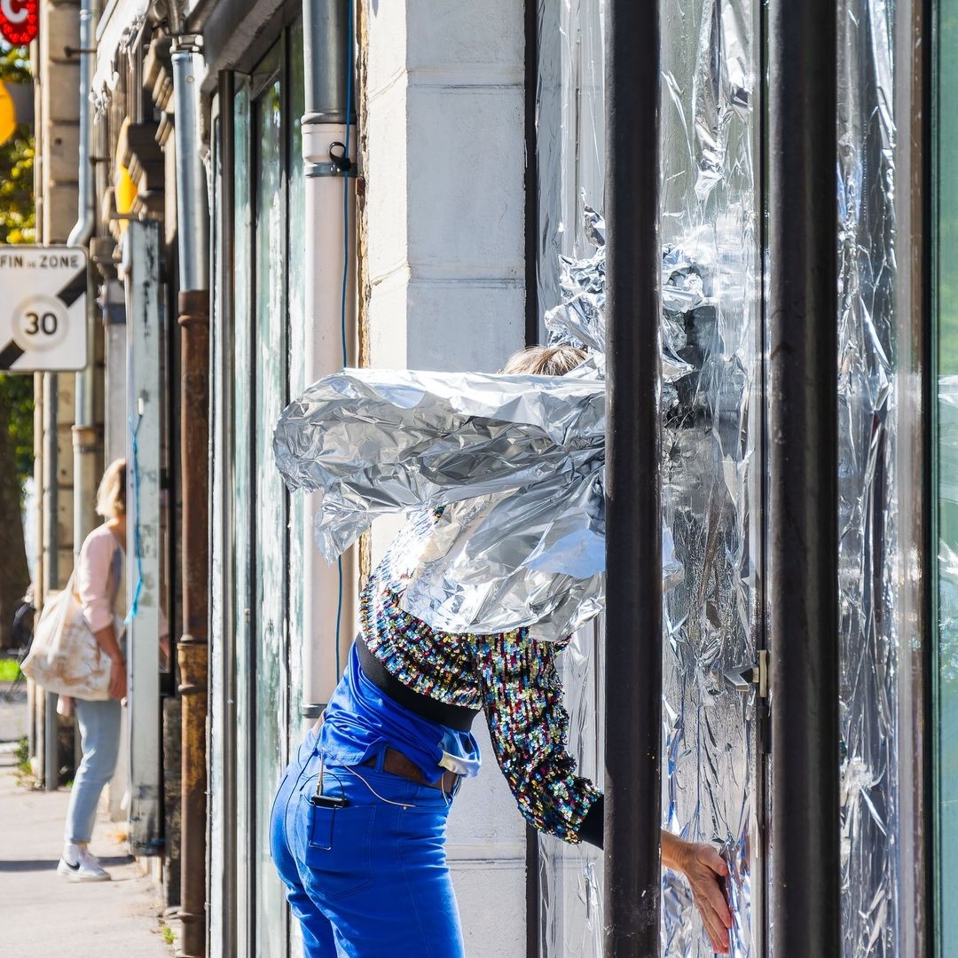 Cela se passe dans un lieu avec une vitrine ou une grande baie vitrée donnant sur la rue. Les spectateurs sont à l’intérieur et regardent au dehors, le cadre de la vitrine opère comme un cadre cinématographique, un lieu d’images. Rendez-vous au 94 de la rue Chabot-Charny pour se rendre au lieu de représentation.